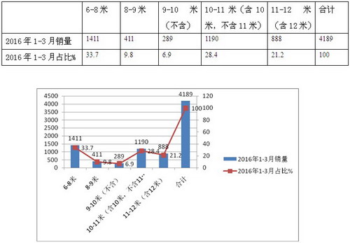 根据上牌数据统计,2016年1-3月按长度划分销量结构如下: