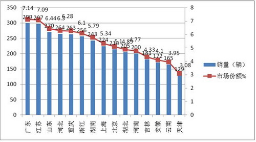 上图表显示,2016年 1-3月前15名新能源客车销售区域共计销售新能源客车3382辆,占据总销量的80%以上,其中广东区域市场份额最大,其次是江苏区域,再次是山东区域。可见,重点区域的市场集中度较高,其余15个区域只有20%不到的市场份额。