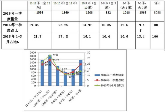 1、2016年一季度,11-12米、10-11米、9-10米等大型团体客车的销量比例均有不同程度的下降,8-9米基本持平,7-8米和6-7米销量均上升。