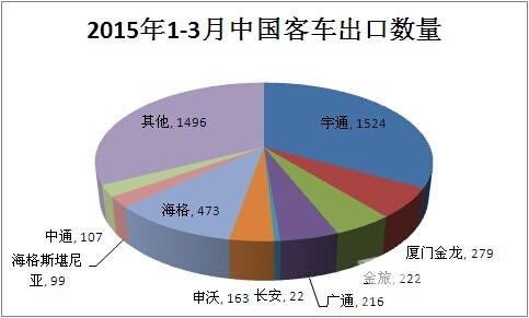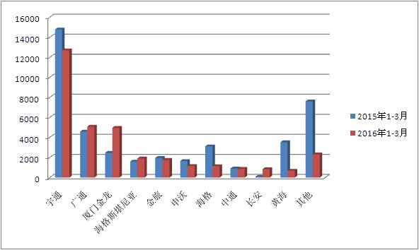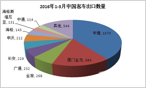 2016年全球经济持续走低,海外市场对于客车的需求进一步缩减。截止到2016年3月底,中国品牌客车累计出口4219台,去年同期为4601台,同比下降8.3%。出口台数见下图: