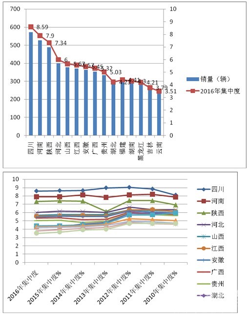 4、四川、河南、陕西、山西、江西、贵州、云南等中西部区域市场的农村客运市场集中度从2009年起到2012年逐年在升高。而到了2013年市场份额都在降低,2016年前4月,陕西、河北、安徽、贵州区域集中度又提高了,其余区域则相对平稳。