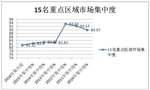 二、重点区域市场集中度分析---2012年前在逐步提高,2013年降低,2014年恢复性提高,2015年同比又出现小幅下滑,2016年继续小幅度下滑