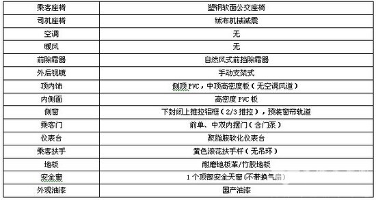 前风挡除霜系统,电动折叠乘客门,杆式倒车镜,铝框推拉侧窗,后行李仓,简易内饰(无成型内饰顶),单体式内顶灯,普通地板革,高靠背司机椅(前后可调式),普通方头乘客座椅(靠背不可调,不可横移,无扶手),2+1布置,不锈钢护栏,收音机,内后视镜,电子钟,实色漆。