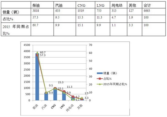 1、2016年1-4月,农村客运市场中销量最大的是柴油,其次为CNG、再次是汽油,第四是LNG,柴油仍然占据农村客运市场57%以上的市场份额,最大的不同是纯电动客车已经开始介入农村客运市场,且同比增幅最大。