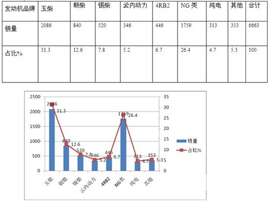 五、按发动机品牌划分,柴油中玉柴、朝柴占主体,其次是锡柴、云内等品牌,汽油4RB2占据6.5%的市场份额
