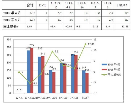 3、 所有长度段销量增幅有正有负,这一点与2015年月份同比数据较不同(2015年全部为正增长)。