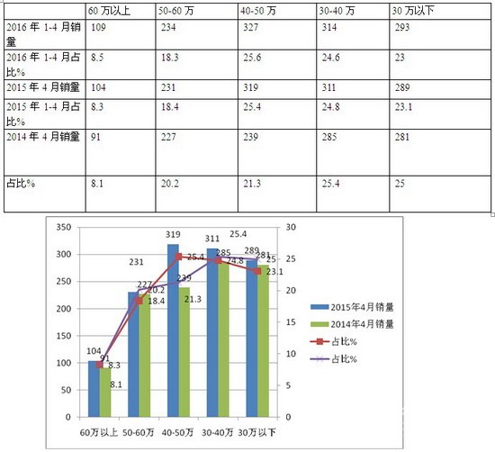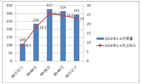 3、2016年4月40-50万价格区段的CNG客车销量权重是25.5%,而2015年同期为25.4%,2014年4月为21.3%,同比逐年在上升,分别上升了0.1和4.1个百分点,也是升幅最大的价格区间,说明CNG客车有继续向40-50万区段更加集中的迹象。