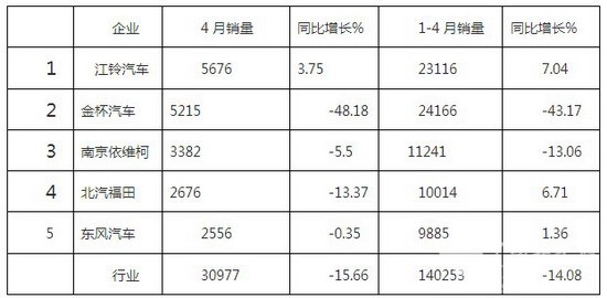 从上 表可见,销量前五企业与去年同期相比是降多增少,仅有排名首位的江铃控股实现3.75%的小幅增长。4月份,轻型客车(含非完 整车辆)市场表现相当“难看”,金杯汽车、南京依维柯、北汽福田和东风汽车公司4家企业均遭同比下降。从累计销量看,2016年前4月轻型客车 销量表(含非完整车辆)市场同比下降14.08%,具体到各家企业看,累计销量实现增长的尚有江铃控股、北汽福田两家和东风汽车公司三家。