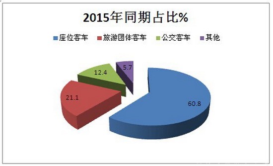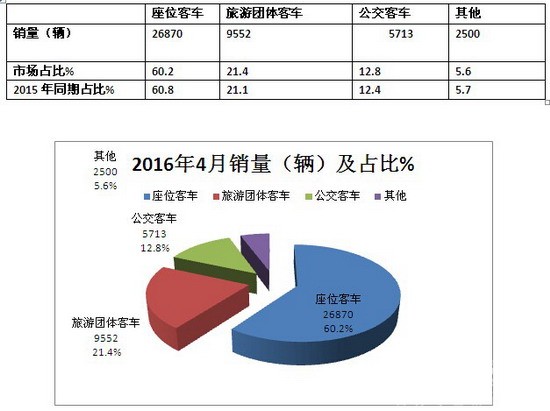 从上图表可知,2016年4月份,在销售的44635辆客车中,座位客车依然占据了最大的市场比例,达到60.2%,但同比下降了0.6个百分点。其次是旅游团体客车,占据的比达到21.4%,同比提高了0.3个百分点,再次是公交客车,占比为12.8%,同比提高了0.4个百分点。