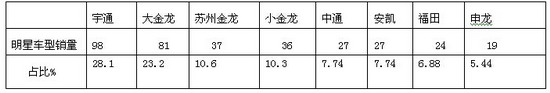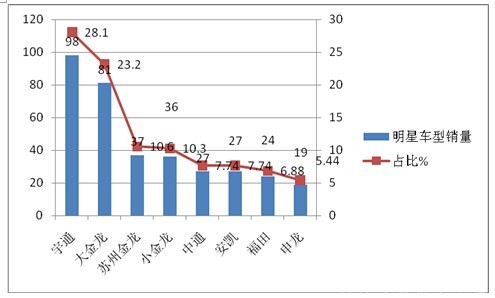 1、2016年4月宇通客车明星车型销量最多,占据主流品牌明星车型销量的28.1%,其次是大金龙,占据了23.2%,再次是苏州金龙占据了10.6%,第四是小金龙占据了10.3%,主要是三龙一通的天下。