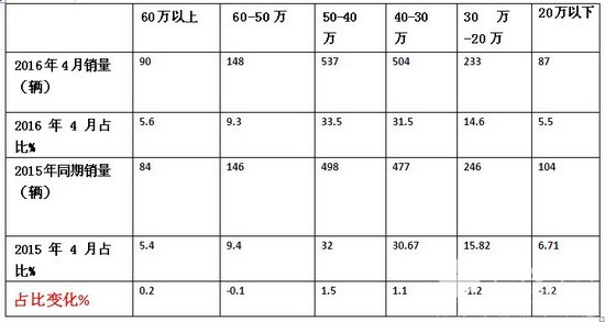 四:按价格区间划分,对2016年4月团体车销量结构进行分析