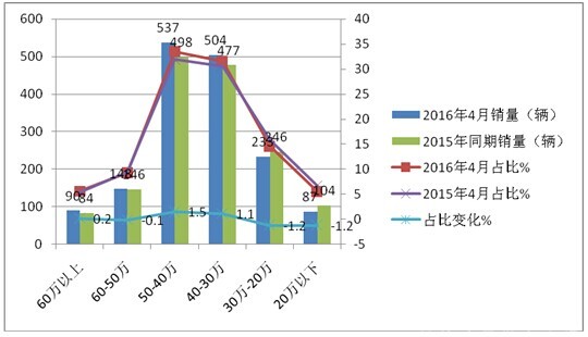 5、通过上述分析,很明显,2016年4月份团体客车高端和低端两个价格区间的产品销量占比较小,而中间段的价格占据主体部分,但同比高端市场提升,低端市场下降。