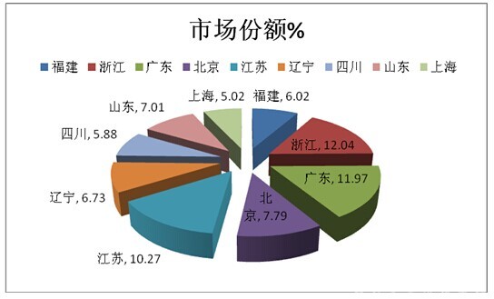 2015年1-4月90万以上高端客车共销售1412辆,比去年同期的1211辆增长16.6%。从价格细分市场看,90万-150万的价格区间销售690辆,150万-200万价格区间销售483辆,200万以上的销售了239辆从销售流向看,浙江是高端客车最大市场,广东第二,江苏第三,具体见(表1):