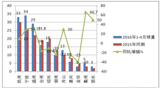 2、 与2015年1-4月相比,浙江省的高档客车销量提高了7.6%,,但具体到各个地市,情况又不一样:即:湖州下降了23.08%,嘉兴下降25%,,绍兴下降10%,金华下降40%,在11个地市中下降最大,但由于基数不大,不能说明什么问题。杭州销量最大,衢州升幅最大。