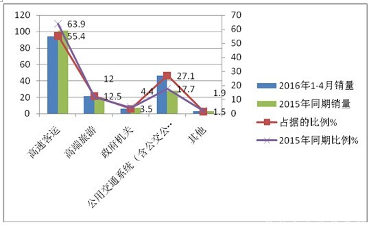按目标市场用途划分,高速客运公司高端客车销量占据了55.4%,比2015年同期的63.9%的市场份额降低了8.5个百分点,是浙江区域高端客车的最大用户。其次是高端旅游市场占比为12.5%,与2015年同期基本持平中升高了0.5个百分点;再次是政府机关公务用车占比为3.5%,同比降低0.9个百分点;第四是公交系统新能源客车占比为27.1%,比2015年同期的17.7%提高了近9.4个百分点,也是浙江高档客车市场中提高幅度最大的细分市场;高速客运市场虽然占据份额最大,但同比呈现下降趋势,根据调研湖州高速客运公司机务处王处长等业内专家,得知主要是因为浙江区域去年通了很多条高铁线路(如杭州—湖州、杭州—合肥、宁波—南京等),对浙江区域的高速客运市场有一定的冲击。