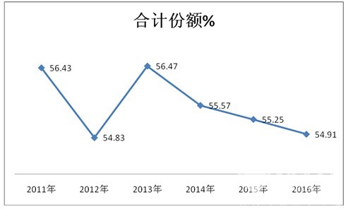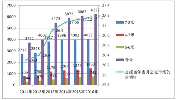 3、近6年来城乡公交市场销量占据当年公交总体市场的份额也在逐年攀升,从2011年1-5月的26.3%稳步上升到2016年1-5月的27.17%,幅度不大,而且有逐步减弱的态势。