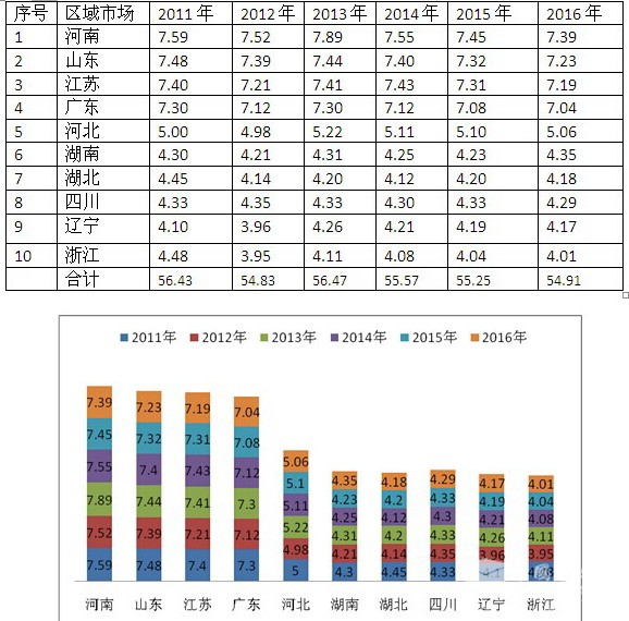 1、河南、山东、江苏、广东、河北、湖南、湖北、四川、辽宁、浙江等销量前10名的主流区域市场城乡公交的市场占有率超过了全国城乡公交总市场的半壁江山,2016年前5月占有率为54.91%,在近6年中处于第五,仅比最低的2012年同期高0.08个百分点,说明到了2016年1-5月份城乡公交车的区域垄断程度较低,其他非重点区域市场的市场机会在增大,从另外一方面也说明,中国农村经济发展的区域存在地区间的不平衡,而且这样的不平衡程度正在减小。