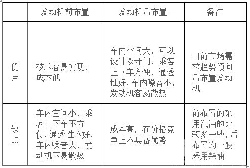2、城乡公交车辆对发动机的布置要求。目前一般7~8米公交车发动机布置的方式有两种:有采取前布置的,也有采取后布置的,但后布置是主要形式。前布置与后布置各有优缺点,主要分析如下表: