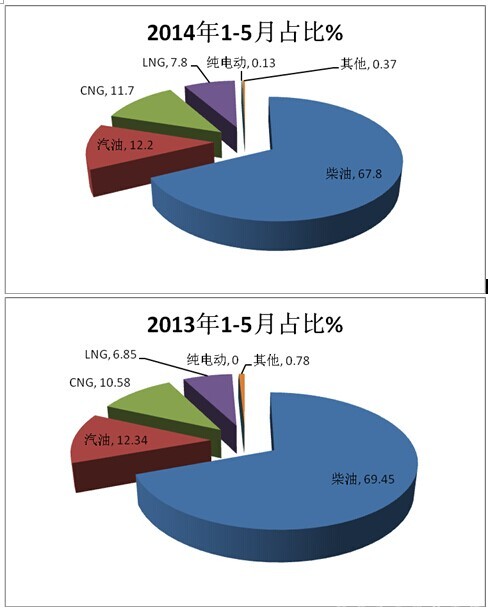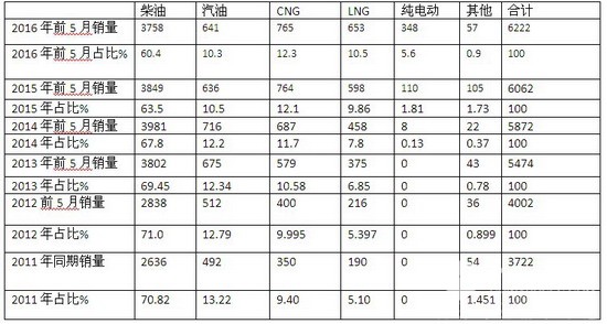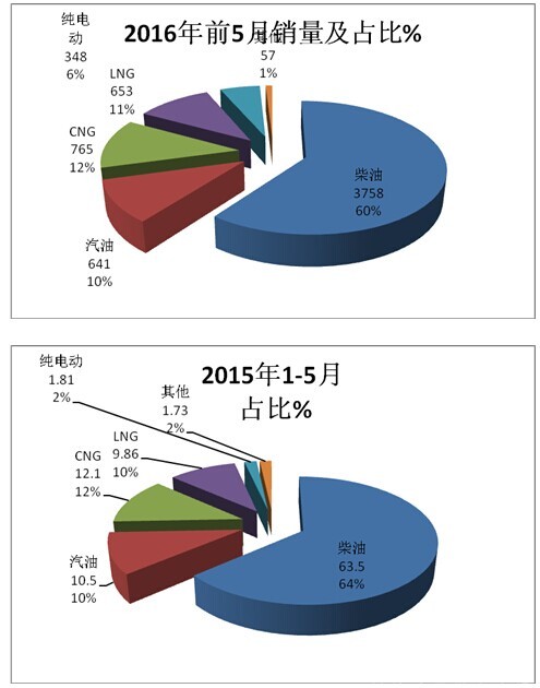 四:按燃料种类划分,分析2016年前5月及近年同期城乡公交市场销量结构---柴油仍然是主体,但比例呈现下降态势,CNG、LNG比例呈现上升态势,纯电动客车进入城乡公交市场逐年在增加