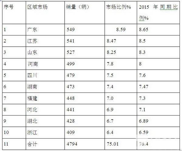 1、广东等10名重点区域7-8米公路客车市场集中度达到75.01%,比2015年同期降低了1.4个百分点,垄断程度明显减弱。