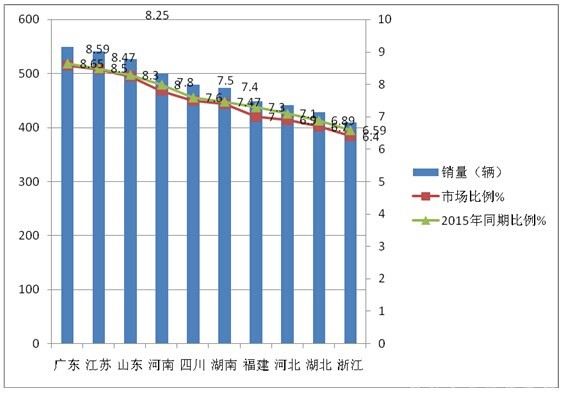 2、7-8米公路客车市场流向分布不均衡,广东、江苏、山东等经济强省的市场份额均超过8%,但同比去年均相应有所降低。