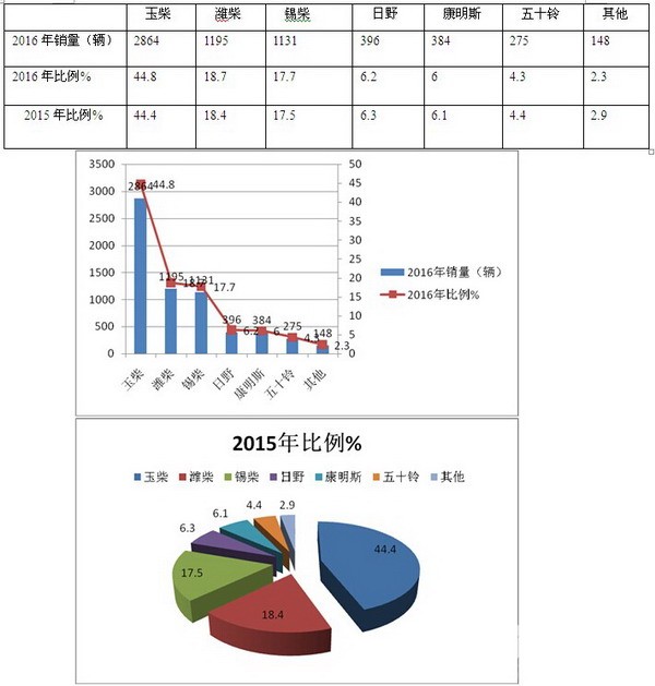 特点三、玉柴发动机占据比例最高,其次是潍柴,再次是锡柴,国产发动机比例占据总销量的比例超过80%,同比有上升迹象;进口发动机以康明斯、日野和五十铃等品牌为主,同比有下降趋势