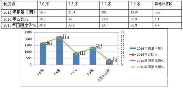 特点四、细分7-8米公路客车长度段,7.5米左右长度段销量最大,其次是7.0米,再次是7.9米,最少的是7.7米;同比7.5米长度销量比例上升,其余下降