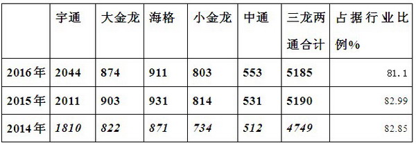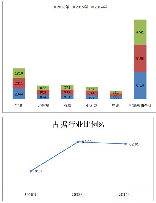 特点五、三龙两通占据行业的前2年逐年升高,垄断程度不断加强,其他二三流客车企业7-8米公路客车市场机会越来越小,而到了2016年1-5月则不再上升,反而下降,出现拐点