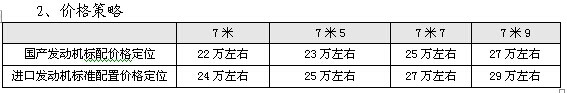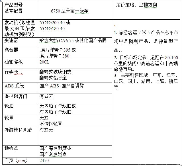 完善7米、7米5、7米7、7米9系列,以国IV排放的国产玉柴发动机为主打,进口机器以美国康明斯和日韩系列(五十铃或日野)为主,瞄准“三龙一通”在该产品系列的市场动态,进而实行跟随战略。将现有的产品外型拓展成新款外型,增加国Ⅳ公告(全国在2013年7月1日后均要国Ⅳ排放才能上牌),以适应更多的市场需求,特别是广东、山东、江苏、河南等这些主要市场的需求。在具体配置上,可以有多种选择,争取以比较宽的产品面来抢占公路客车13%以上公路客车市场份额。7米5的高一级车做到27+1+1座位,这样与竞争对手7米9车比,更具有竞争力。价格在28万以内,比较有竞争力。