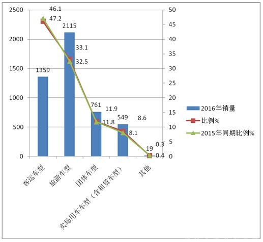 2、 2016年前5月客运车型同比比例在下降,下降幅度达到1.1个百分点;旅游客车在上升,团体客车、卖场租赁客车的比例也均在上升,其上升幅度分别为0.6%、0.1%、0.5%,说明7-8米公路客车的客运车型市场份额受到了高铁、火车等交通工具的挤压,而旅游客车由于空载率相对大车较低而受到市场欢迎,团体客车、卖场租赁车型的市场2016年受到市场环境的影响也相对好转,这给7-8米公路客车的生产制造商们一个明确的启示。