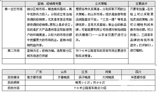 可以把广东、山东、江苏、河南、四川、湖南等确立为7-8米公路客车的第一主打市场,把湖北、福建、河北、浙江、辽宁等作为第二市场,对不同市场采取不同的策略。采取直销为主、经销为辅的方针。直销可以采取人海战术,多派驻业务人员,直接寻找目标客户,经销可以在重点区域市场寻找经销商,利用当地的资源和渠道来拓展市场。