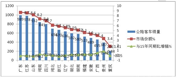 2、广东、江苏、山东是11-12米公路客车销量前3名的区域市场,这3个区域11-12米公路客车占有的市场份额为25.5%,超过了四分之一,但同比下降了0.2个百分点。