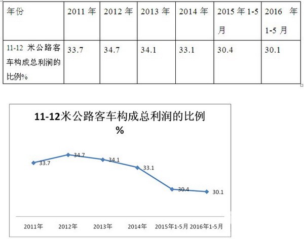 从上述统计可以看出,近6年1-5月11-12米公路客车在主流企业的利润占据其总体利润的比例均在30%以上,在2013年以前呈现逐年上升态势,但在2013年后却出现逐年下降态势,也就是说,主流公路客车企业的利润超过3成是由11-12米公路客车贡献的,但近3年有萎缩的迹象。根据市场调研,近年来,新能源客车的利润在各企业的权重逐渐加大,因此挤压了11-12米公路客车的利润权重。
