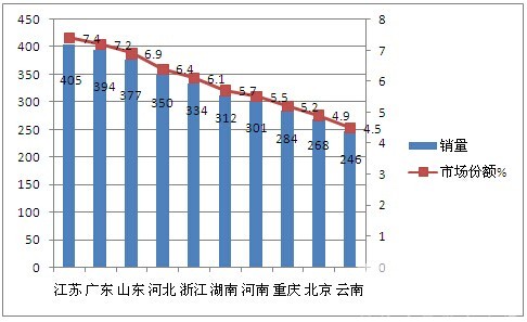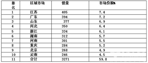 上图表表明,2016年1-5月纯电动座位客车分布不均衡,前10个主流市场销量占比达到59.8%,接近6成,其余20个区域市场只有40%左右的市场机会。
