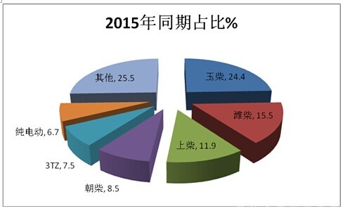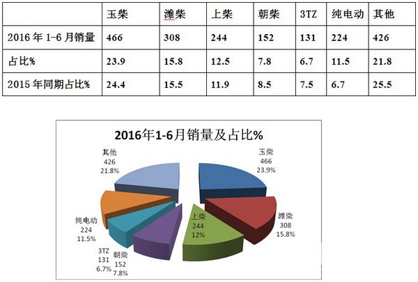 从上图表可以看出:2016年1-6月客车专用车市场中,玉柴权重最大,但下降幅度也最大,纯电动客车同比增幅最大,增幅达到4.8个百分点。