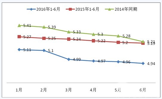 1、2016年上半年的1-6月,LNG公交客车与公路客车的销量比指每月均大于4.9,且2016年每月的比值均小于2015年对应的月份(2016年1-6月的曲线均在2015年之下),说明LNG公交客车大于LNG公路客车,且LNG在公交领域2016年上半年各月的销量的绝对占据优势要小于2015年相对应的各月,而2015年又小于2014年。
