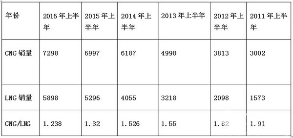 2、近6年上半年CNG客车与LNG客车的销量比值从2011年的1.91逐年下降到2016年的1.238,充分说明近6年的燃气类客车市场在发展过程中,CNG的发展速度相对LNG来说较为缓慢,换句话说,目前燃气类客车产品由CNG客车向LNG客车加速过渡,构成 NG类客车的市场结构比例正在发生改变。原因如下: