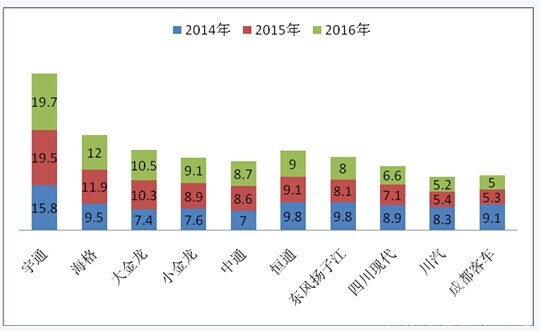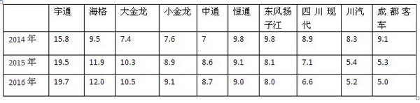 2014年,位居销量前5位的LNG燃气客车生产企业依次是宇通、恒通、东风扬子江、海格客车、四川现代等,这五家企业中LNG客车年销量份额最少都在10%左右。2016年,位居销量前5位的LNG燃气客车生产企业次序悄然发生变化,客车老大宇通位仍然稳居第一位,海格、大金龙、小金龙、中通等客车行业的主流企业LNG客车的销量比例位次均比上年明显提升。而东风扬子江、四川现代等位次逐步被拉后,可见,主流企业LNG客车市场份额占据主导地位,传统优势的LNG客车企业正在逐步被边缘化
