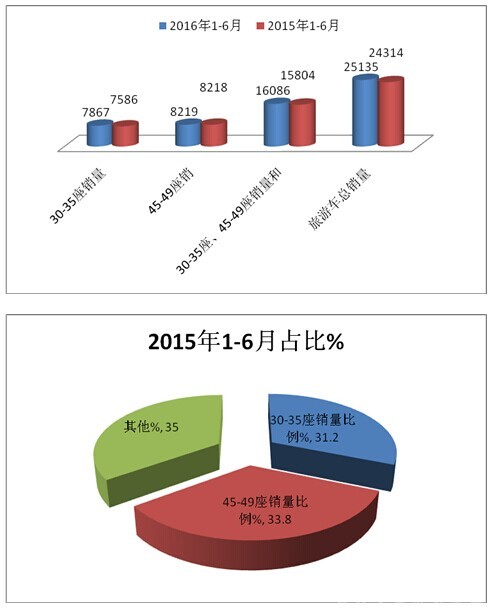 一、销量分布主要扎堆在30-35座和45-49座这两个细分区间,并有向30-35座更加集中的趋势----按座位数来细分旅游客车市场,30-35座、45-49座左右的旅游客车受旅游市场青睐,市场集中度达到 64%,比2015年同期低出近1个百分点;30-35座产品市场份额比2015年有所提高,45-49座的产品市场份额比、2015年有所下降。根据对目标用户的调查,旅游团分为大团和小团,一般大团在47人左右,小团在33人左右,所以,旅游客车主要集中在10-11米、11-12米、8-9米和7-8米等长度段上, 2016年1-6月旅游车30—35座与45-47座位销量、比例情况与2015年同期比情况如下表(表1):