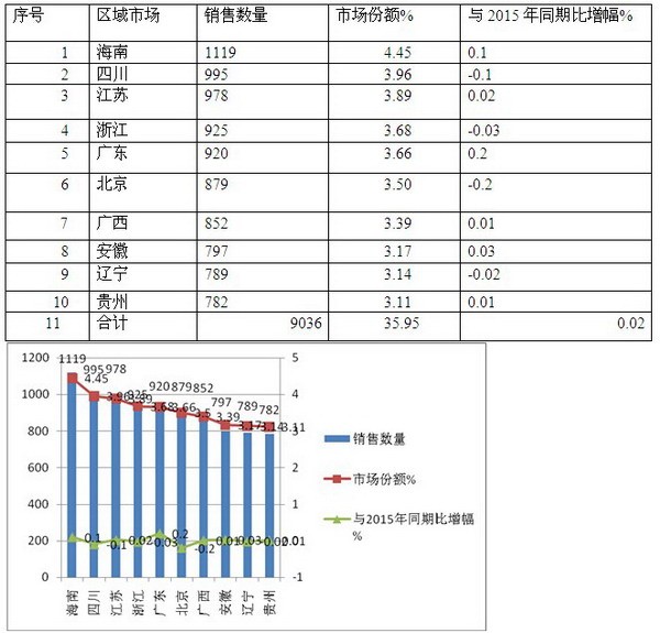 2、海南等10名区域市场的市场集中度为35.95%,同比提高0.02个百分点,说明区域市场竞争基本维持在一个相对平衡的状态。