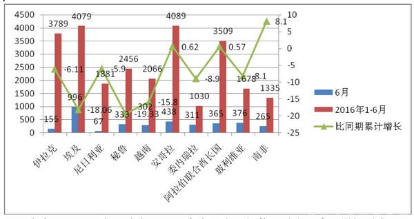 上图表表明:2016年上半年出口国家中,安哥拉数量最多,南非增幅最大。出口前10个国家中,大部分出口数量同比都是下降的,这也是导致上半年客车出口市场萎靡不振的重要因素之一。