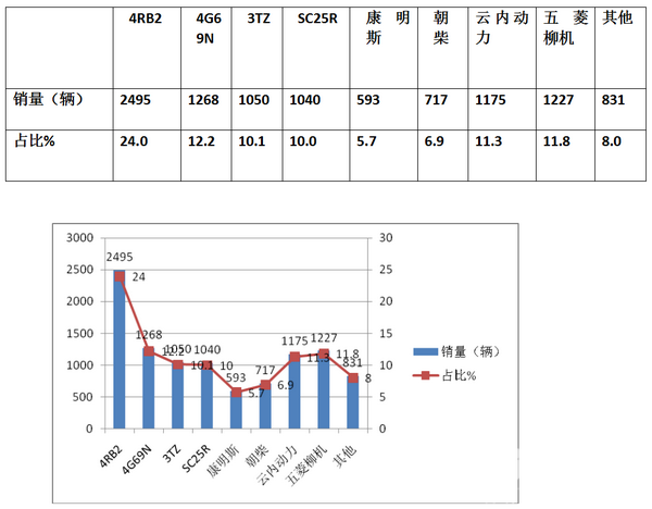从上图表看出:轻客品牌的轻型客车-- 绵阳4RB2汽油机占据的权重最大,其次是三菱发动机4G69N汽油机,再次是五菱柳州机器发动机;总体看汽油机占据主体地位,柴油机器主要以上柴SC25R和康明斯为主。