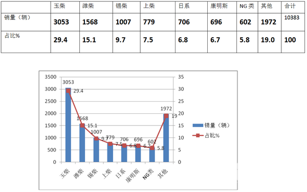 根据海关数据统计,2016年1-6月各类轻型客车出口大约10396辆,按发动机品牌划分销量结构分析如下表: