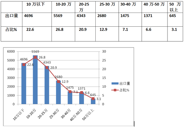 上图表表明,2016年1-6月客车出口量在10万以上的价格中,基本规律是:价格越高,出口量越小。即出口量与价格成反比。从此也可以看出,目前我国出口海外的客车基本上是价格在30万以下(80%以上)的中低档次车型。