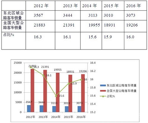东北区域大型公路客车占据全国公路客车的权重从2012年的16.3%逐年下降到2014年15.6%,也就是说。东北区域大型公路客车的市场集中度前3年前6月一直处于下降通道,市场相对处于萎缩状态,到到了2015年前6月,又出现恢复性上升,同比上升的幅度为0.3个百分点,2016年继续延续2015年的增长态势。