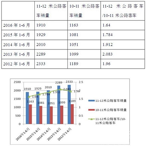 特点二、2012年到2014年前6月,11-12米公路客车销量一直是10-11米公路客车近两倍,但到2015年11-12米公路客车地位相对10-11米公路客车大大消弱,2016年继续延续2015年的趋势
