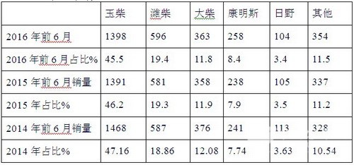 根据车管部门信息统计,2016前6月,东北区域大型公路客车主要配置用的国产发动机大约占据到78%左右,主要是玉柴发动机,其次是潍柴发动机,再次是大柴;进口发动机主要以康明斯为主打。
