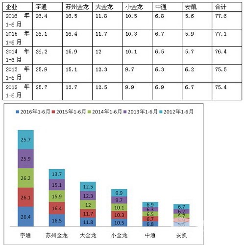 5、老牌子高档客车的生产企业安凯客车,其实最大的高档客车优势领域也在10-12米公路客车这个细分市场,但2016年1-6月销量份额在东北市场处于第六,集中度增幅幅0.3%,其传统的强势市场在广东、浙江、四川、安徽等区域。