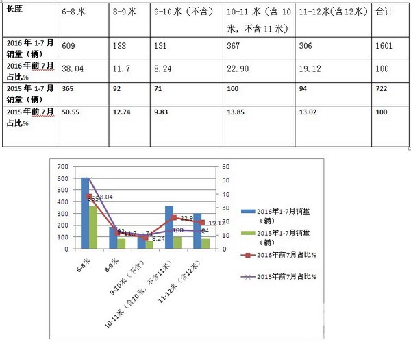 2、按长度段划分,对2016年1-7月江苏区域新能源客车销量分析