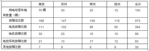 从上表看出,南京、苏州、常州、扬州四个区域市场的抽样的纯电动客车在运营中出现故障频次最高的均是电池故障,而且占比都达到60%以上,换言之,纯电动客车出现故障的主要原因是由于电池技术质量的不过关导致的。